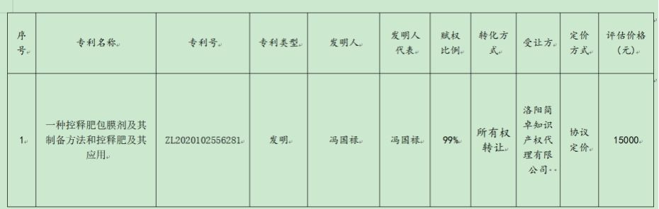 根据《中华人民共和国促进科技成果转化法》《赋予科研人员职务科技成果所有权或长期使用权试点实施方案》(国科发区〔2020〕128号)等相关文件规定,经成果完成人申请,学院组织论证,现对《一种控释肥包膜剂及其制备方法和控释肥及其应用》项专利实施赋权转化予以公示: