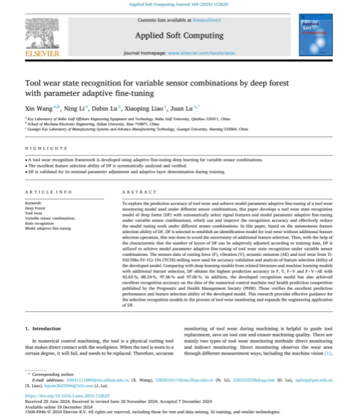 近日,机船学院鲁娟教授团队以北部湾大学为第一单位,鲁娟教授为通讯作者,硕士研究生汪鑫为第一作者,在国际顶级期刊《Applied Soft Computing》上发表学术论文《Tool wear state recognition for variable sensor combinations by deep forest with parameter adaptive fine-tuning》。《Applied Soft Computing》是计算机科学领域的国际权威学术期刊,在最新的中科院SCI分区为1区TOP期刊,2024年影响因子为7.2。