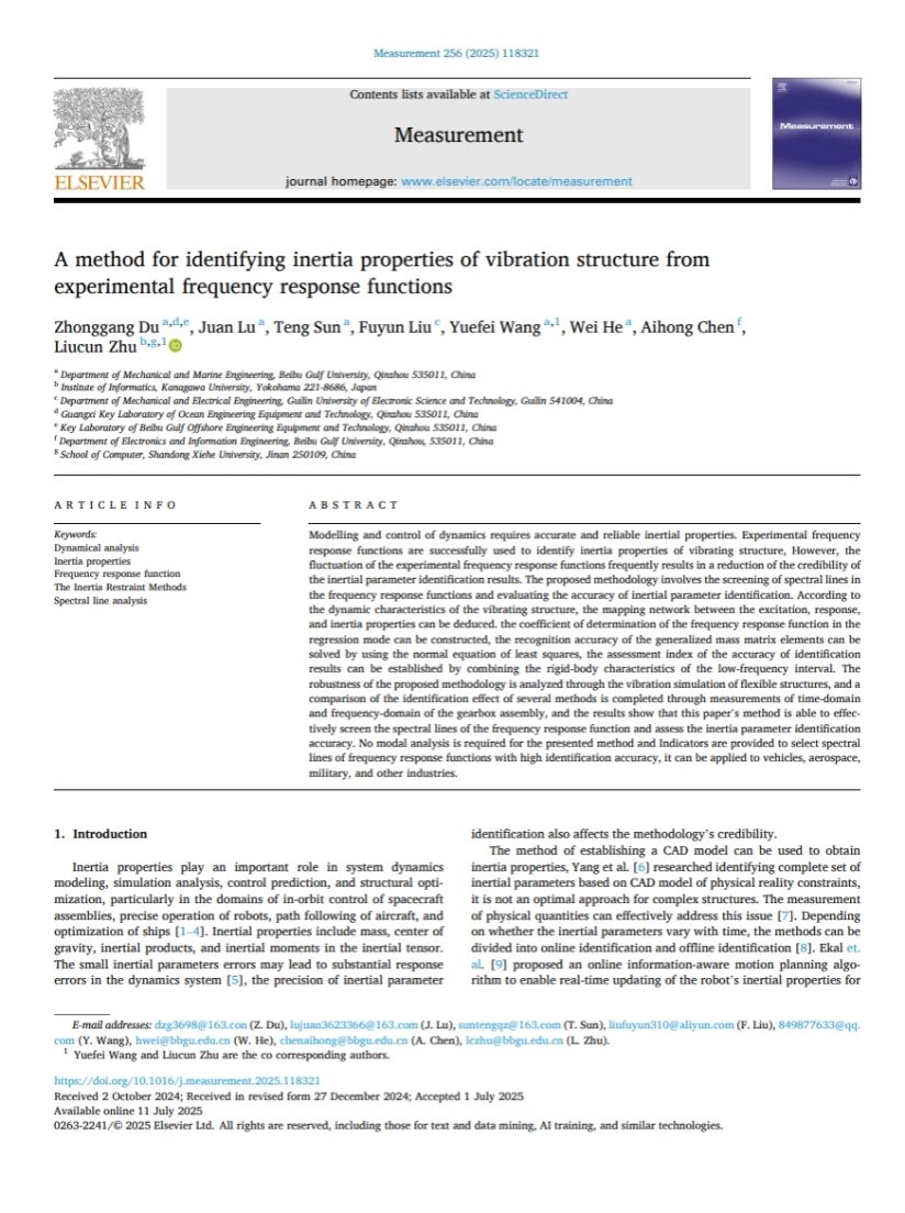 近日,机船学院杜中刚老师作为第一作者,在国际知名期刊《Measurement》上发表学术论文《A Method for Identifying Inertia Properties of Vibration Structure from Experimental Frequency Response Functions》。《Measurement》是机械工程领域的国际知名学术期刊,在最新的中科院SCI分区为2区,最新影响因子5.6,在测量与仪器科学领域具有较高的认可度。