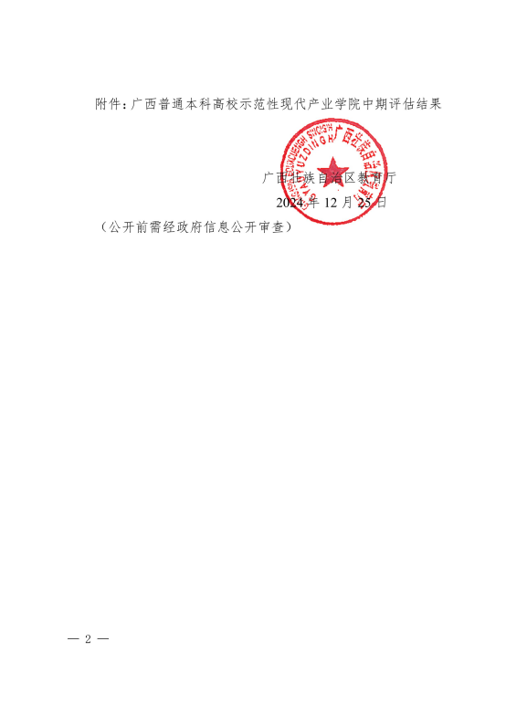 根据“桂教高教〔2021〕50号 关于公布广西普通本科高校示范性现代产业学院名单的通知”,全区共立项建设50个示范性现代产业学院,经过两年半建设,2024年初,教育厅组织专家对50个在建示范性现代产业学院进行了评估检查。