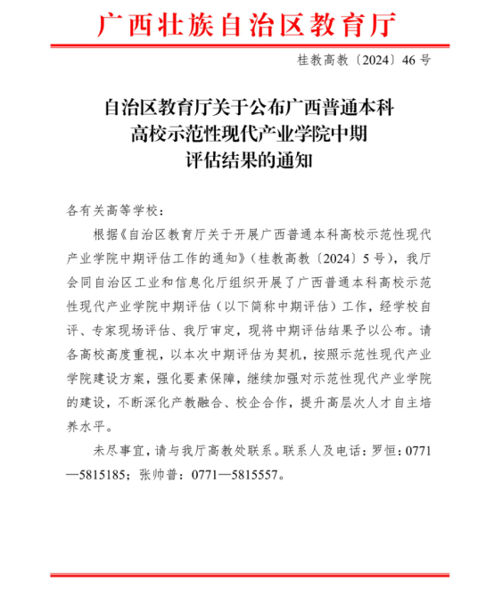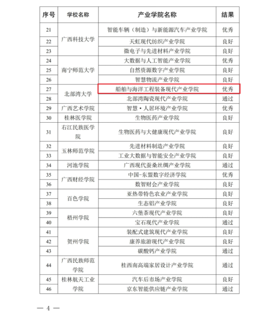 根据广西壮族自治区教育厅下发的《自治区教育厅关于公布广西普通本科高校示范性现代产业学院中期评估结果的通知》(桂教高教〔2024〕46号)文件,机船学院的船舶与海洋工程装备现代产业学院中期评估获得优秀的好成绩。