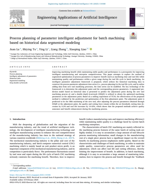 近日,机船学院鲁娟教授作为第一作者,以北部湾大学为第一单位,在国际顶级期刊《Engineering Applications of Artificial Intelligence》上发表学术论文《Process planning of parameter intelligent adjustment for batch machining based on historical data segmented modeling》。《Engineering Applications of Artificial Intelligence》是计算机科学领域的国际权威学术期刊,在最新的中科院SCI分区为1区TOP期刊,2024年影响因子为7.5。