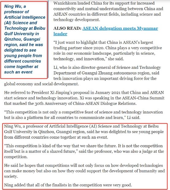 赛后,吴宁博士接受了《中国日报》海外版记者的采访。吴博士在接受采访时表示,能够受邀担任此次大赛的评委,既是荣誉也是责任。他期待通过这一平台,与来自中国和东盟国家的优秀创新创业者进行深入交流,探讨科技创新和产业发展的新趋势和新机遇。同时,他也希望为参赛团队提供专业的指导和建议,助力他们实现创业梦想,并为东盟国家的发展甚至人类社会的发展做出贡献。