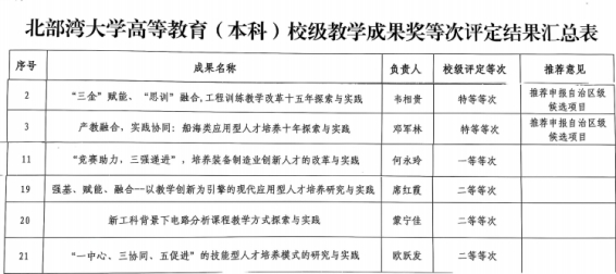 韦相贵教授主持的 “三金赋能、‘思训’融合,工程训练教学改革十五年探索与实践” 项目以及邓军林教授主持的 “产教融合,实践协同:船海类应用型人才培养十年探索与实践” 项目荣获特等等次,并被推荐为申报自治区级候选项目。何永玲教授主持的项目荣获一等等次,席红霞、蒙宁佳以及欧跃发老师主持的项目荣获二等等次。
