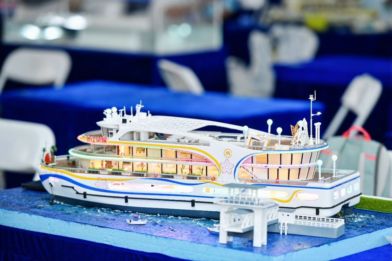 作品简介:模型外观完美还原“江豚逐浪”的仿生设计,流畅灵动的线条勾勒出船体在江面上破浪前行的动感姿态,每一处弧度都精准呼应着原型的优雅与力量。四层构造层次分明,各楼层的功能分区与布局特点清晰可辨,让人能快速感知这艘游船的空间结构与多元使用场景。 尤为精妙的是,模型生动呈现了诸多动态细节:螺旋桨随机械传动平稳转动,模拟出航行动力;灯光系统可随场景切换明暗,还原昼夜航行的光影变化;舵机灵活转向,展现游船操控的精准;锚链则能通过细微机械结构实现收放动作,将真实船舶的运作逻辑微缩呈现。