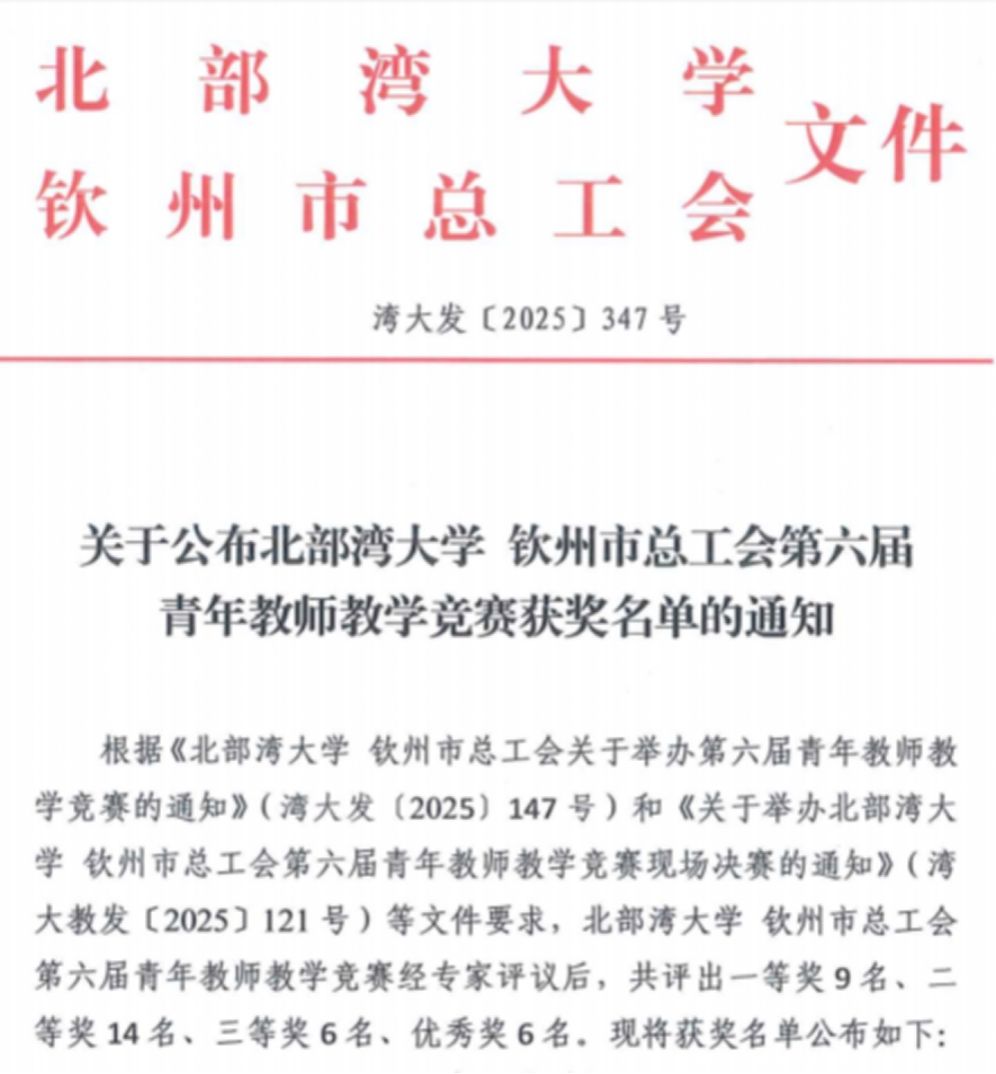 近日,机船学院蒙宁佳和何海龙老师分别获得北部湾大学 钦州市总工会第六届青年教师教学竞赛工科组二等奖和三等奖,充分展现了我院青年教师扎实的教学功底与昂扬的精神风貌。