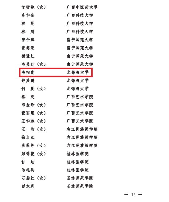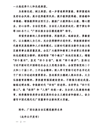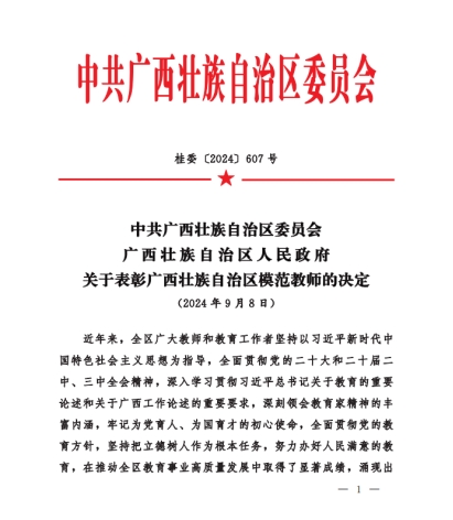 9月8日,自治区教育厅下发《关于表彰广西壮族自治区模范教师的决定》(桂委〔2024〕607号),授予黄红华等398名个人“广西壮族自治区模范教师”称号。机船学院韦相贵教授荣获“广西壮族自治区模范教师”称号。