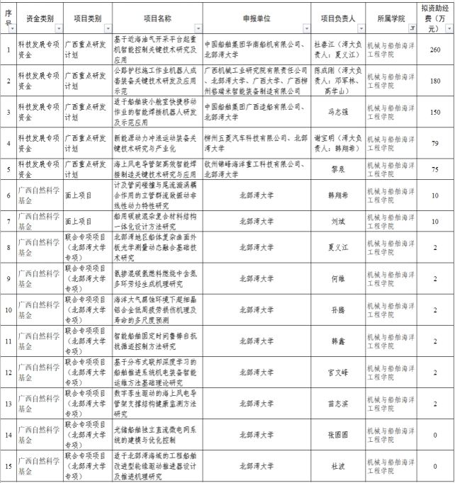 近日,从广西壮族自治区科学技术厅官网获悉,2024年集中申报广西科技计划项目机船学院15项获得立项公示,其中:主持广西重点研发计划项目获得2项立项,参与申报的广西重点研发计划项目获得3项立项,广西自然科学基金面上项目获得2项立项,广西自然科学基金联合专项项目获得8项立项,合计拟获资助经费776万元,项目数和资助经费均创历史新高,机船学院将以此为契机,严格按照项目要求,科学规划、精心组织项目实施,确保项目顺利推进并取得预期成果。
