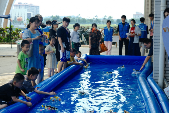 在北部湾大学大学生志愿者带领下,小朋友及其家长们先参观了船模展示并进行船舶与海洋知识的答题,了解我国船舶的发展史。之后体验拼接小船、DIY小船和小船竞速,锻炼小朋友们的动手能力和耐心,加深小朋友们对船舶结构的了解,也提高了亲子之间的合作意识。还有投木签和亲子跳绳趣味活动,为现场增加了趣味性和互动性。使整个活动充满欢快愉悦的气氛。